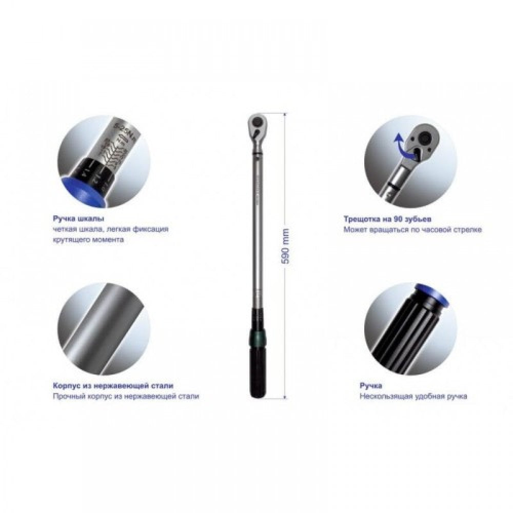 Професионален динамометричен ключ за затягане в комплект с ударни вложки и удължител. Максималното усилие при затягане, което може да се зададе от динамометъра е 60 Nm.