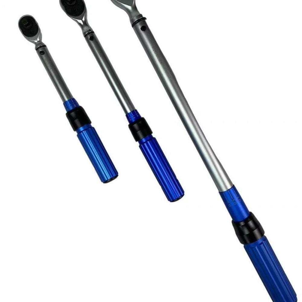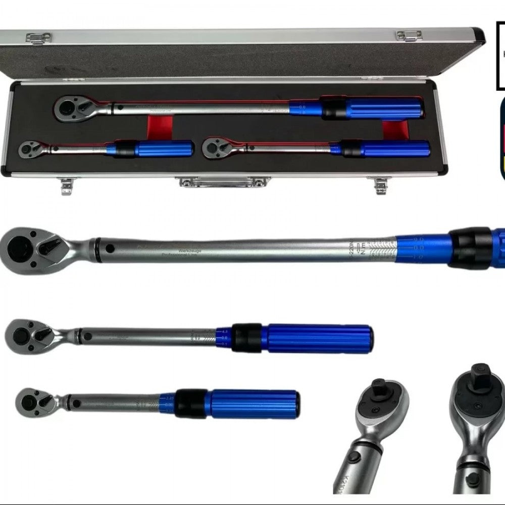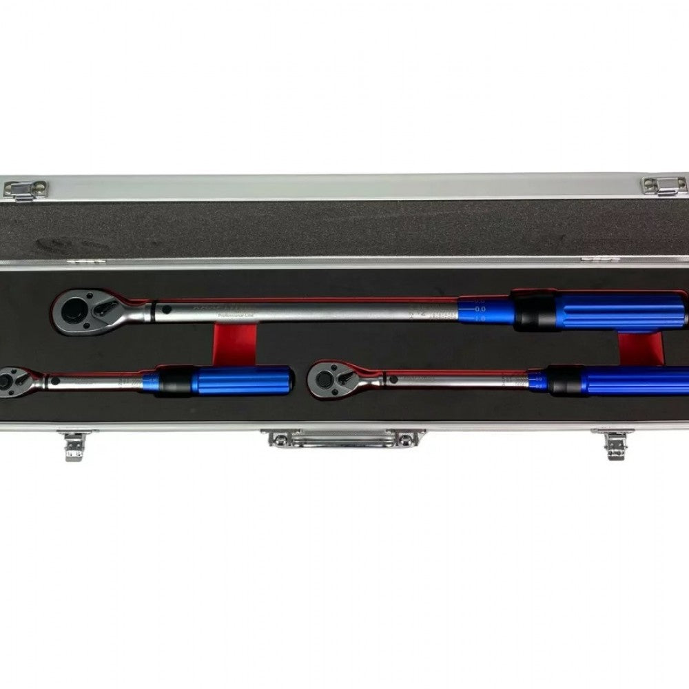 Професионален комплект динамометрични ключове, състоящ се от 3 динамометрични ключа с реверсивна тресчотка с фини зъбци и 45 зъба в здрав алуминиев куфар с вложка от пяна. Подходящ както за домашна употреба, така и за професионална употреба в автосервизи.