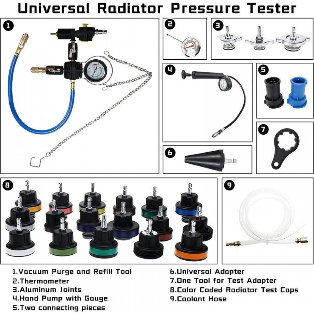 Комплект за измерване налягането в радиатора и охладителната система Hawek съдържа 28 части и включва универсален тестер за радиатор и комплект за източване и зареждане с охладителна течност на охладителната система чрез вакуум. Комплектът включва още манометър с работно налягане 0-35 psi, помпа с накрайник и бърза връзка, клапан за налягане, както и радиаторни адаптери за тестване на налягане и течове.