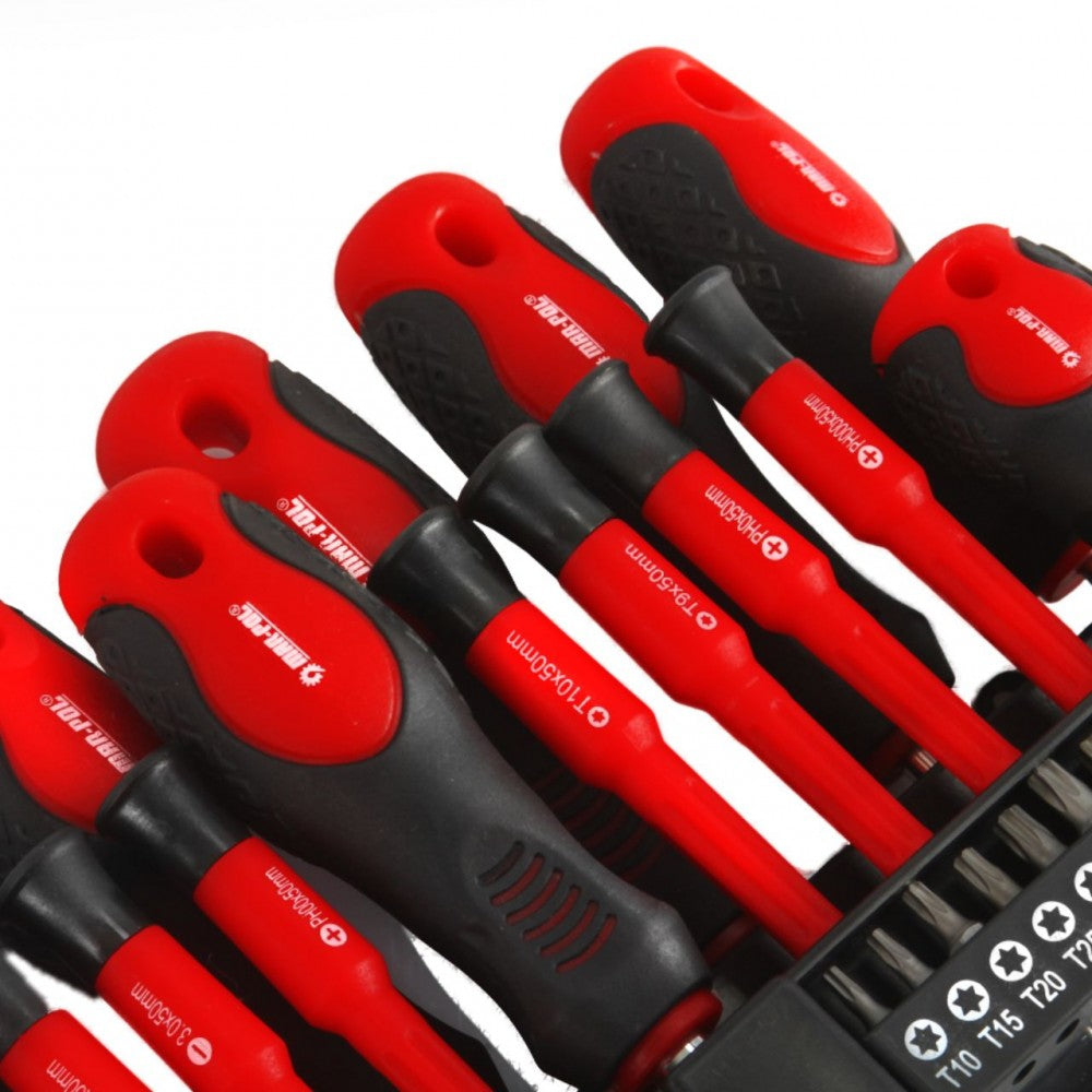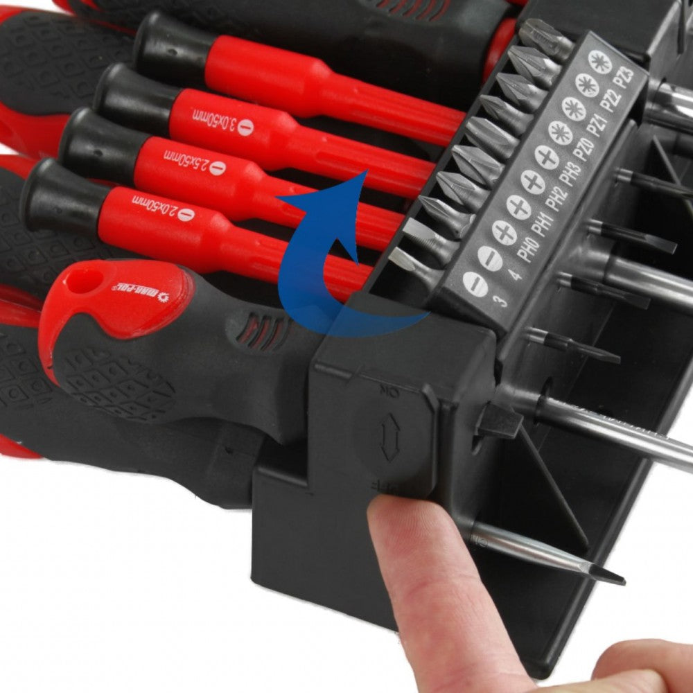 - 8 x прецизни отвертки – 2.0 x 50 мм, 2.5 x 50 мм, 3.0 x 50 мм, T 9.50 мм, PH 00 x 50 мм, PH 0 x 50 мм, PH 1 x 50 мм, T10 x 50