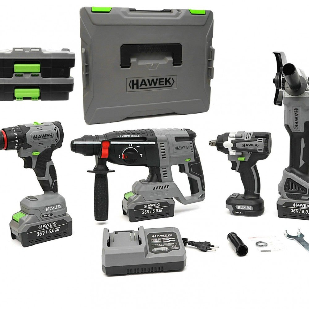 Комплект от акумулаторен перфоратор, ъглошлайф 125 мм, гайковерт и винтоверт 36V с 3 броя батерии 5Ah в куфар и зарядно HAWEK