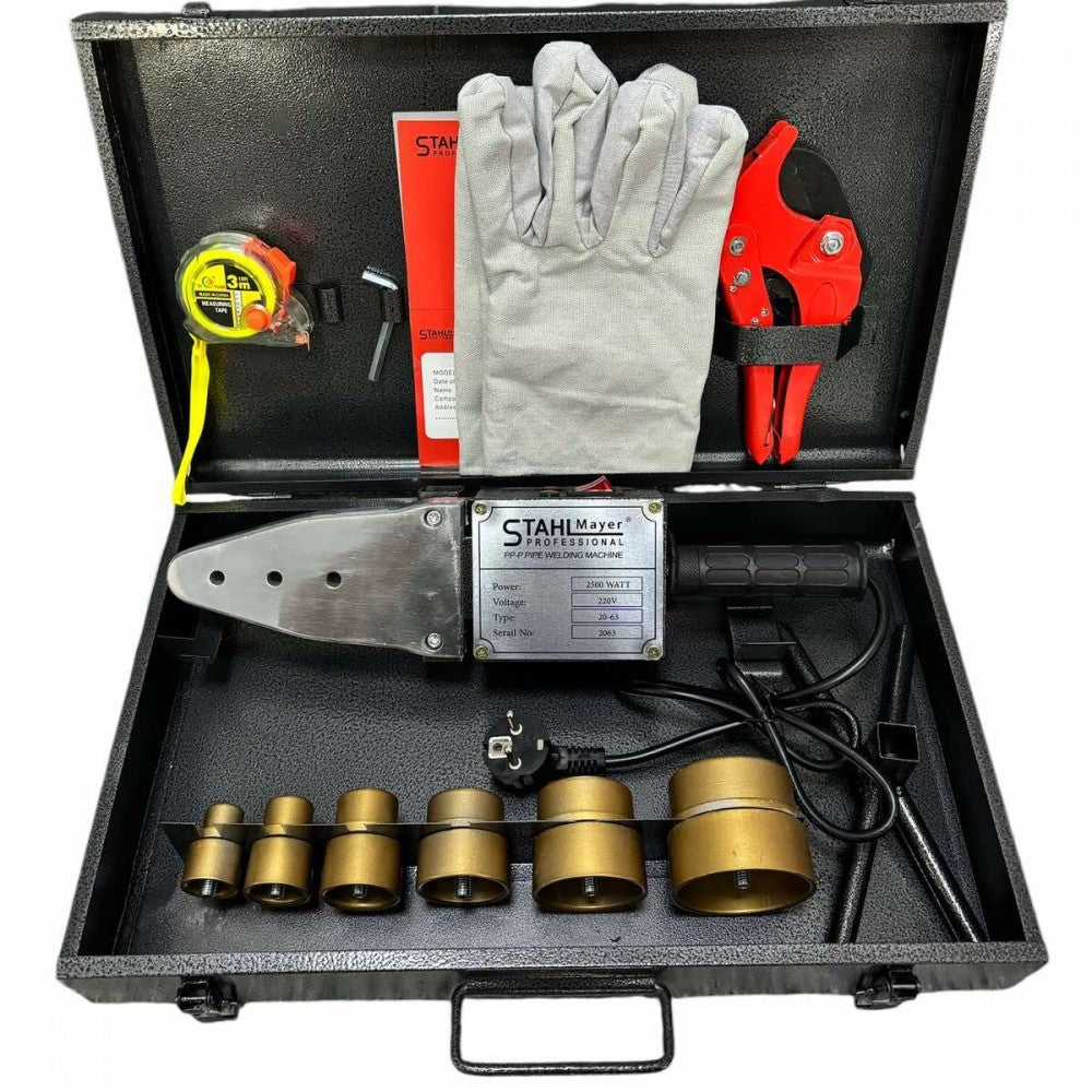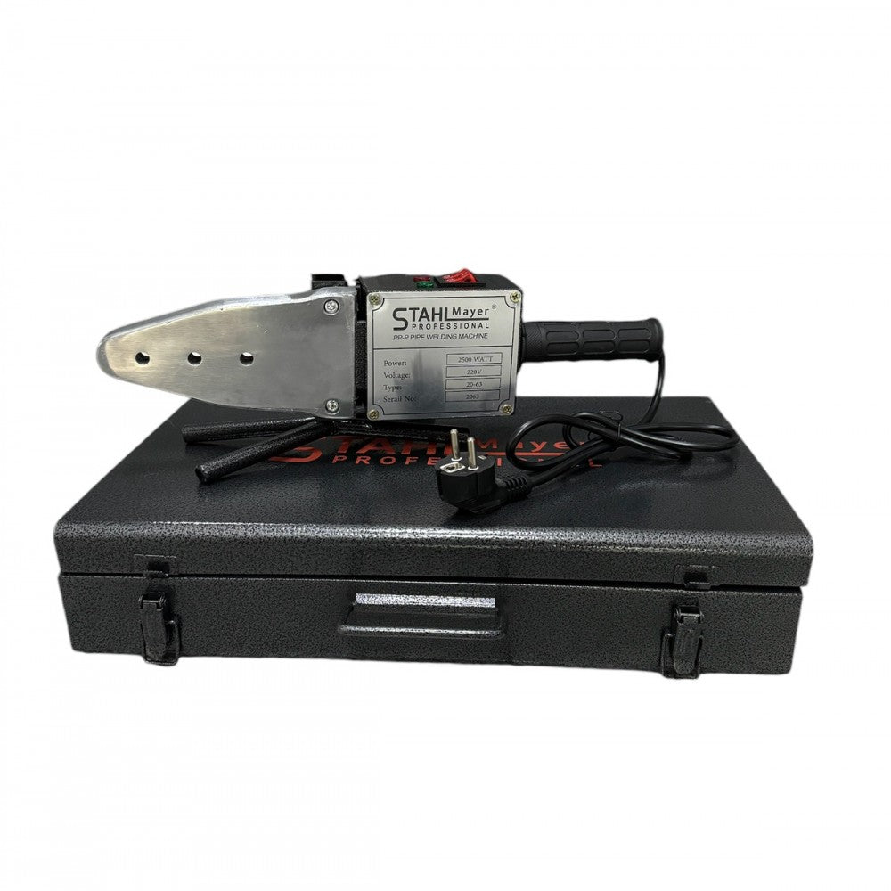 Заваръчен комплект за полипропилен STAHLMAYER 2500W за запояване на полипропиленови тръби и фитинги. Работи от 50 – 300 градуса. Регулацията на температурата.