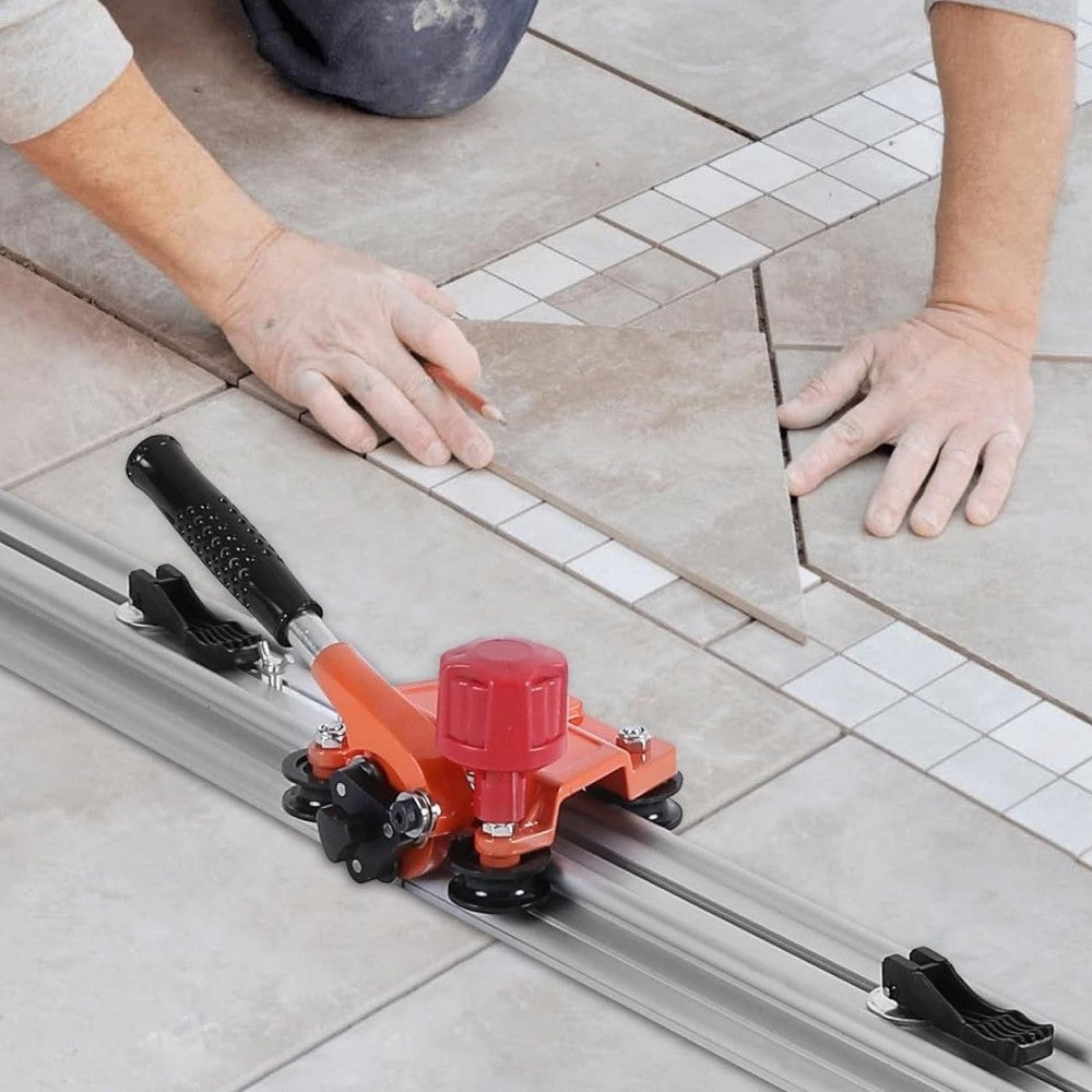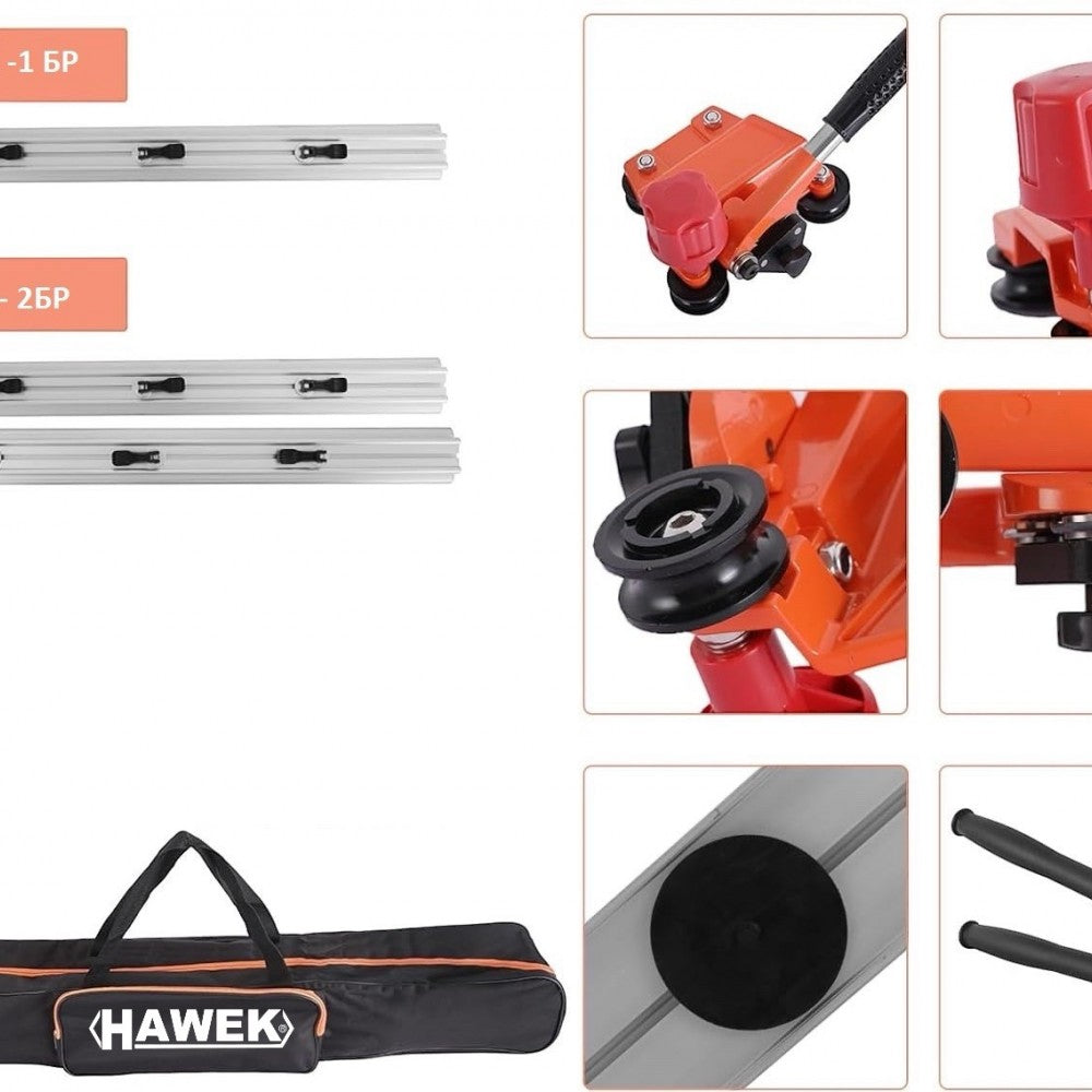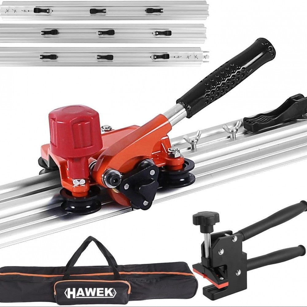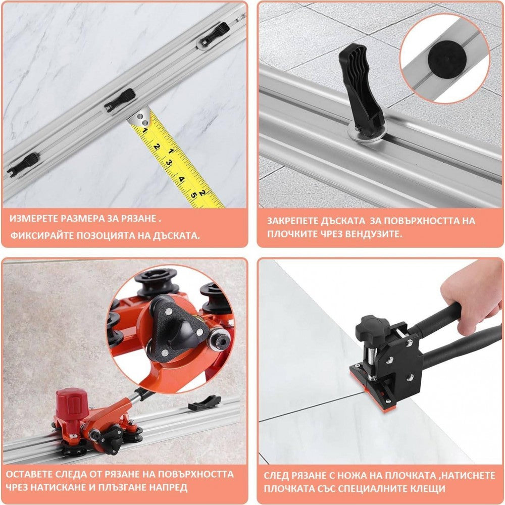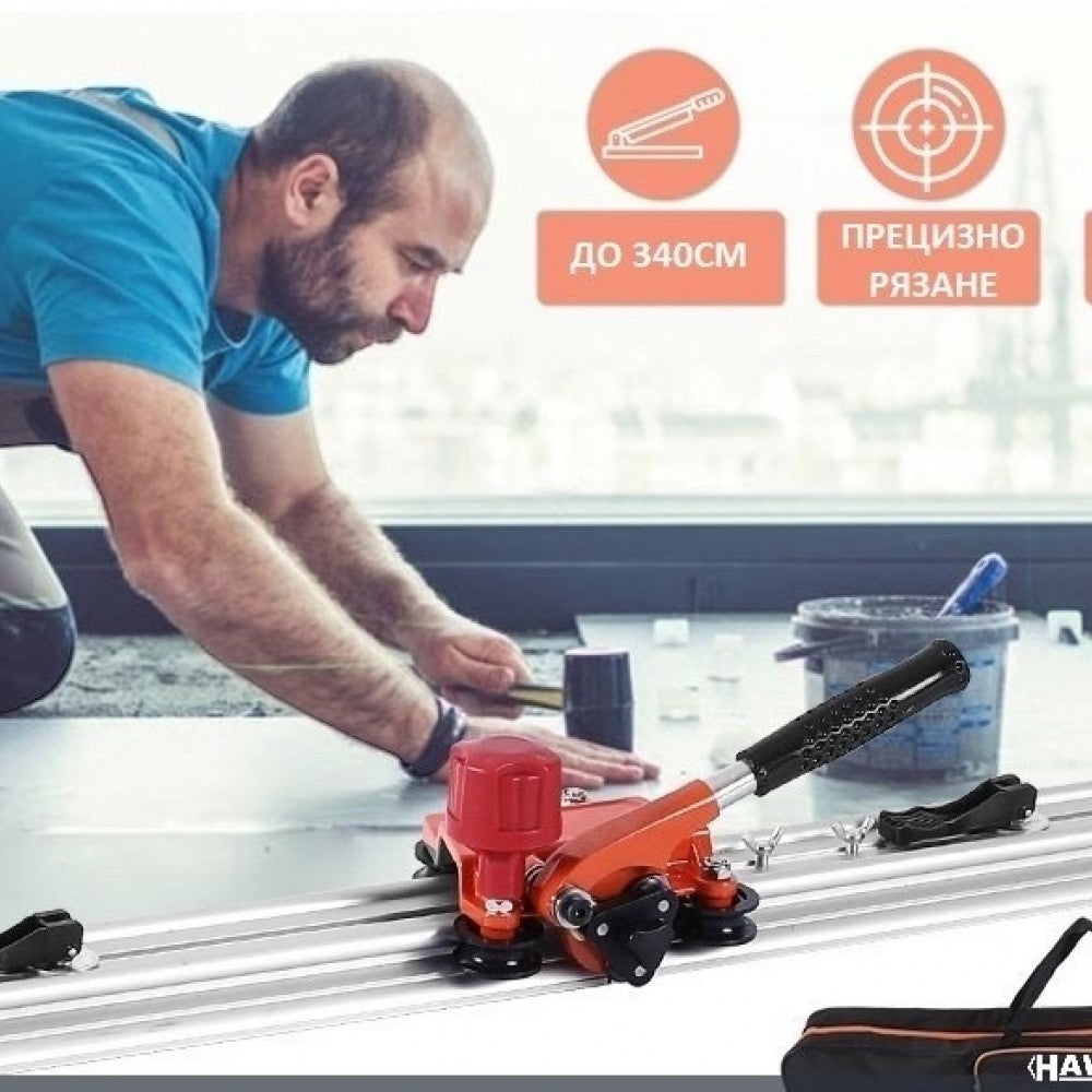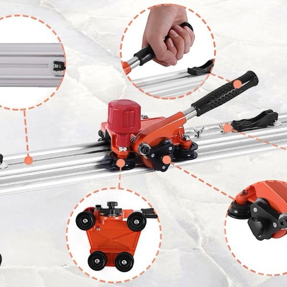Машината за рязане е специално проектирана за порцеланови плочки с формати по-големи от 300 см x 100 см и с дебелини от 3 до 8 мм. Водачите са изработени от алуминий и са сглобени заедно, за да гарантират перфектен резултат, винаги на 1 см от ръба на самия водач. Вендузите ще ни помогнат да фиксираме водача върху плочката и да предотвратим движението му. Каретката за нарязване, с дръжка за улесняване на работата, монтирана с Ø 22 мм волфрамов карбид с лагери, специално за извършване на тези задачи с по-дълги резултати.