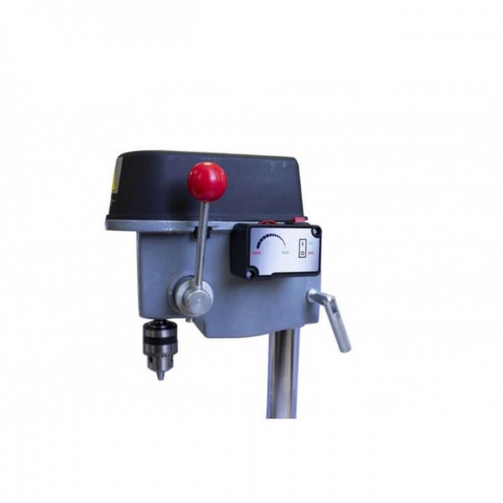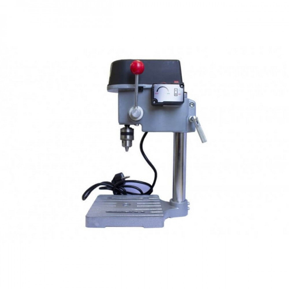 Настолната електрическа бормашина е със стабилна устойчива основа от алуминиева сплав, фрезована с Т–образни канали. Бормашината има удобен механизъм за регулиране дълбочината на прореза и стопер за пробиване. Двигателят е мощен и тих, с дълъг експлоатационен живот. Оста се задвижва с ремъчна предавка с три шайби и това създава 6–кратно увеличение на въртящия момент при ниска скорост, особено подходяща за пробиване на широки отвори. Точен механизъм за подаване на шпиндела. Шпинделът на 1/2″ за захващане на патронник е включен в комплекта. Възможност и за цангов захват.