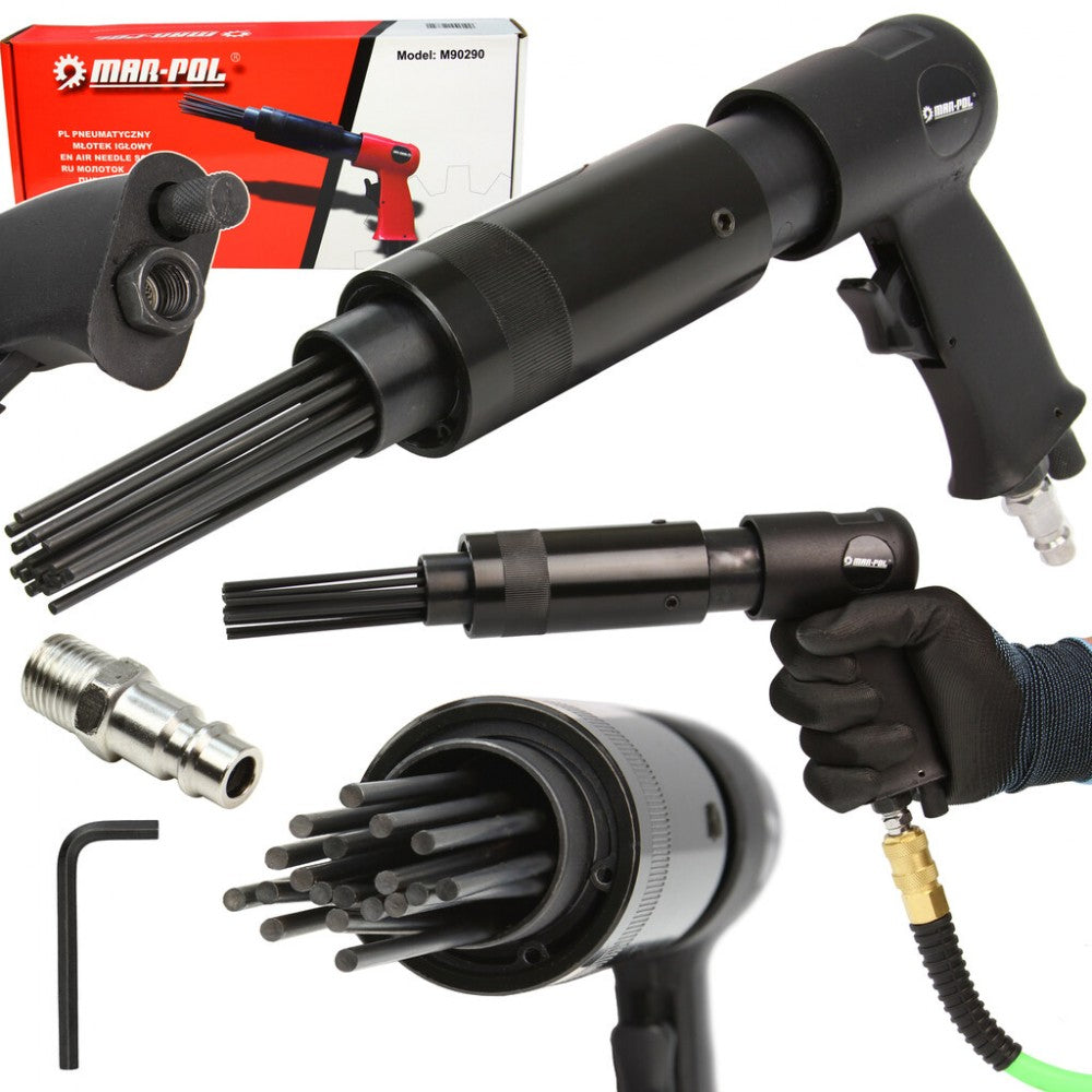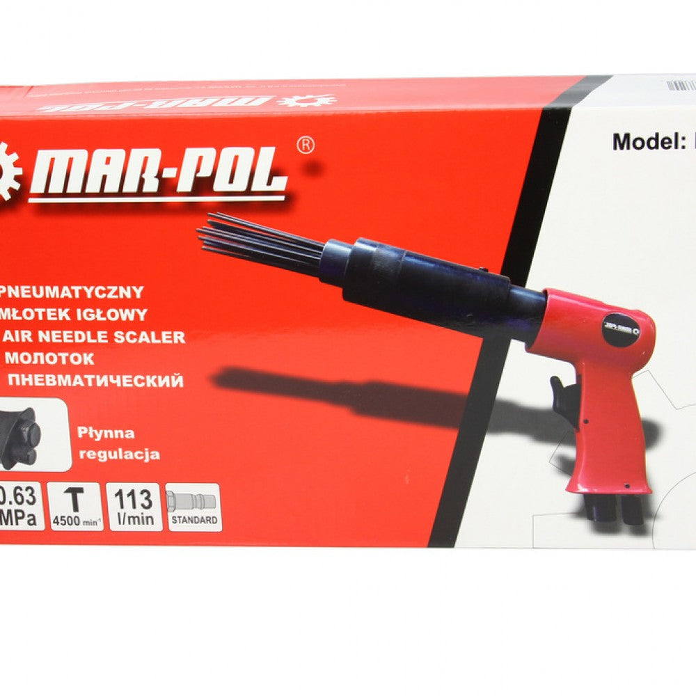 Пневматичен иглен чук МARPOL, 19 игли, 6.3 бара е инструмент, предназначен за премахване на котлен камък, ръжда, боя от повърхностите на автомобила. Успешно се справя с премахване на различни наслоявания от джантите, колелата и други метални повърхности на автомобила. Инструментът е с удобен захват и компактни размери и е подходящ за бояджийски цехове, автомобилни работилници, производствени предприятия или домашни гаражи и работилници. Игленият чук дава възможност за обработване на неправилни повърхности. Чукът е с патрон с 19 игли и максимално работно налягане 6,3 бара. Максималният му капацитет е 113 литра/мин.