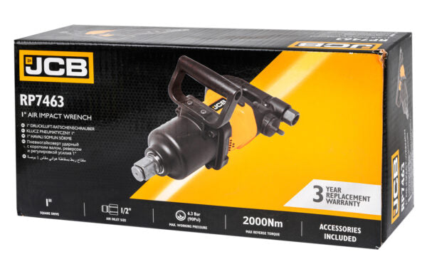 Пневматичен ударен гайковерт JCB , RP7463 е с максимален въртящ момент 2000Nm. С подсилен корпус от устойчив композитен материал. Лесна работа . Устройството има регулируема сила на затягане и разхлабване. Ергономична дръжка и компактен размер.