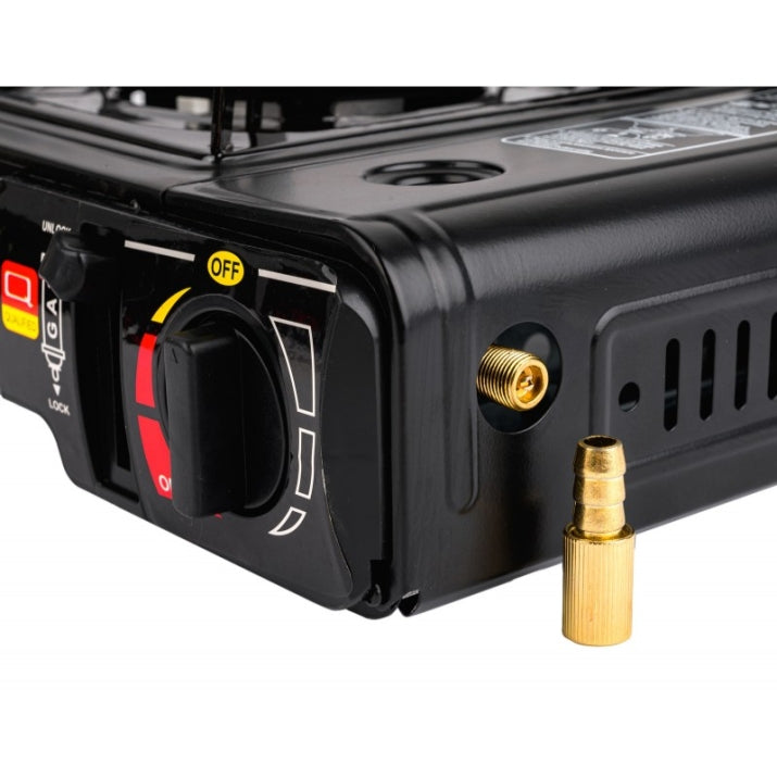 - Работи както с портативни газови бутилки, така и със стандартни къмпинг, и битови бутилки за газ.