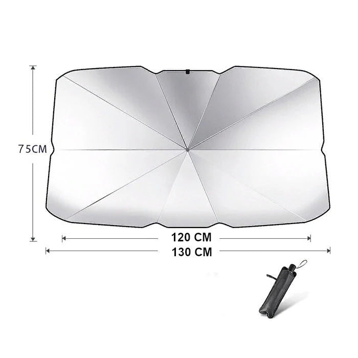 Начин на употреба: Отворете чадъра и го поставете на предното стъкло в колата и го фиксирайте със сенници. След употреба сгънете като обикновен чадър и след това го приберете в калъфа.