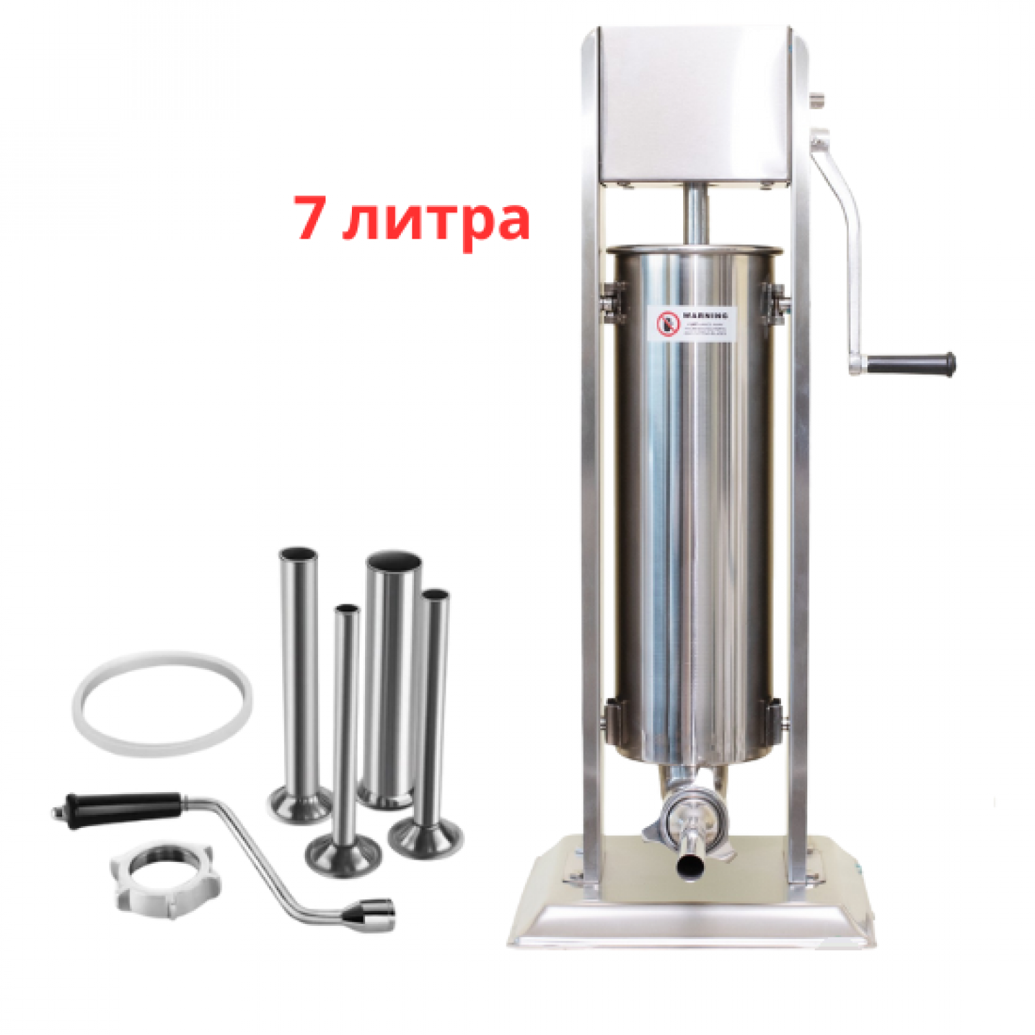 Пълначка за месо - наденици и колбаси 7 литра е подходяща както за професионална, така и за домашна употреба. Механичната пълначка е с вертикално разположение и вместимост 7 литра. Изработена е от висококачествена неръждаема стомана с антикорозионно покритие, не окислява и не отдава вредни съставки в продукцията. Машината е снабдена с ергономична ръкохватка и бутало, което се задвижва посредством манивела и избутва местната заготовка към отвора. Пълначката е изключително практична, тъй като не съдържа електрически компоненти и позволява лесно почистване. Разглобява се лесно и по този начин могат да бъдат почистени всички елементи на машината. Предлага се в комплект с 4 фунии с различни размери. Машината е с висок работен капацитет, компактни размери и ниско тегло.