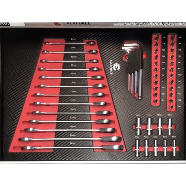 Масивна конструкция на шкафа , инструментите са наредени на масло устойчива EVA пяна . Комплектът включва звездогаечни ключове изработени от хром ванадиева стомана . Тресчотките са , изработени от хром-ванадиева стомана CrV6140. Тресчотките са оборудвани със системата QUICK RELASE и механизъм със 72 зъба.