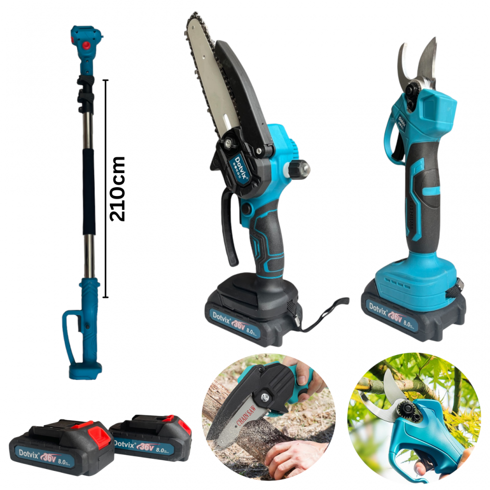 Открийте професионалното решение за поддръжка на лозя, овощни градини и дървета с 3в1 Акумулаторен комплект Dotvix 36V 8Ah. Този мощен и удобен инструмент обединява електрическа лозарска ножица, мини акумулаторен трион с омасляване и телескопичен прът с дължина 210 см, за да работите лесно, бързо и без усилие.
